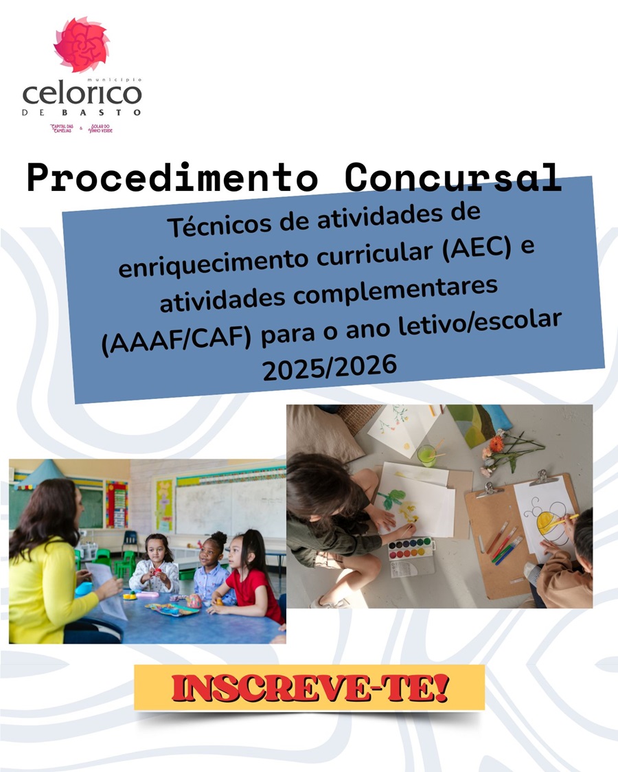 A autarquia de Celorico de Basto informa que está aberto o procedimento concursal de recrutamento e seleção para contratação a termo resolutivo certo, a tempo parcial, de técnicos de atividades de enriquecimento curricular (AEC) e atividades complementares (AAAF/CAF) para o ano letivo/escolar 2025/2026. Mais informações no site do município.