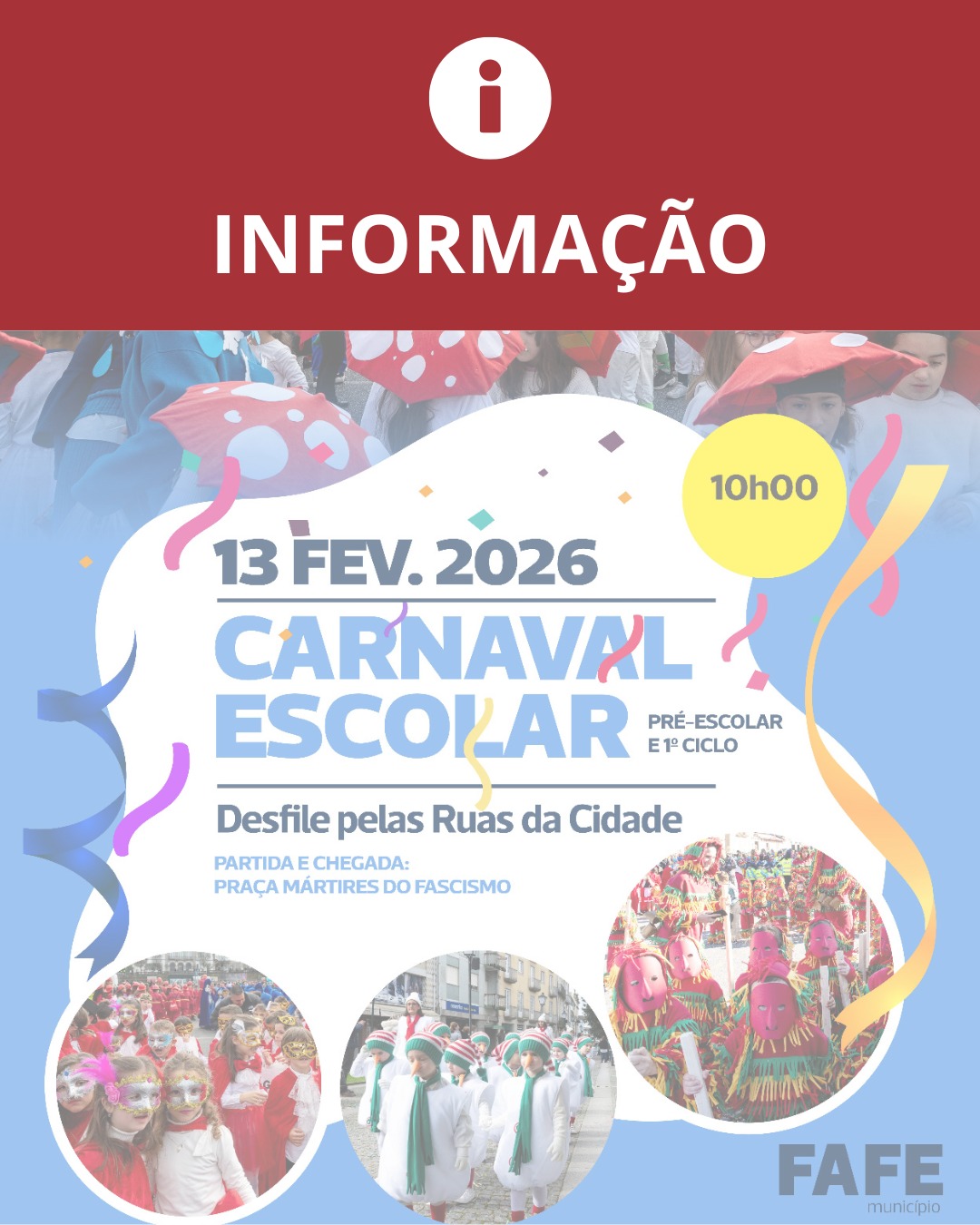 O Município de Fafe informa que o Desfile de Carnaval Escolar do concelho, tradicionalmente organizado em estreita colaboração com os agrupamentos de escolas e demais instituições de ensino e educação, não se realizará na próxima sexta-feira, dia 13, devido às condições meteorológicas previstas.