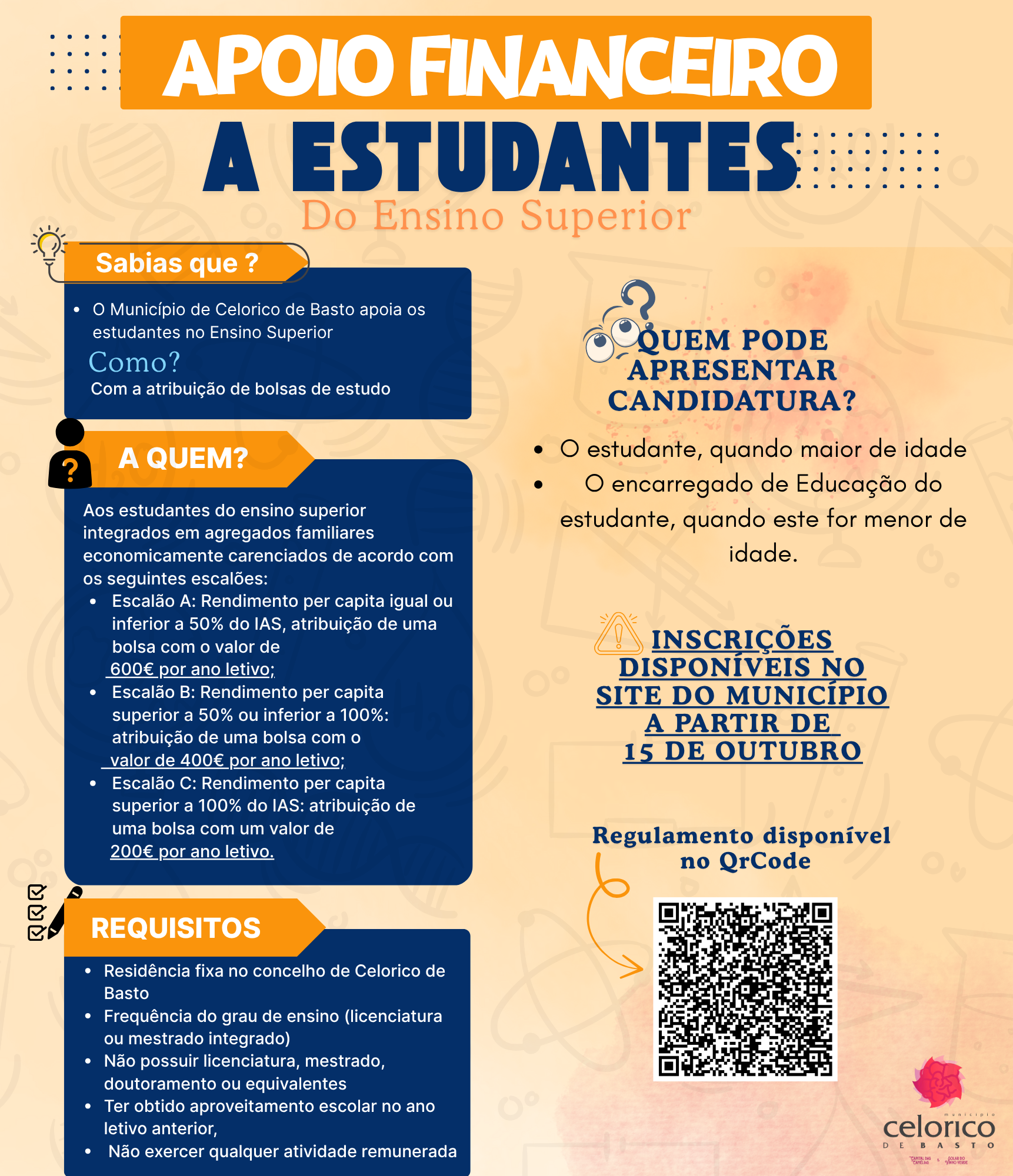 O município de Celorico de Basto tem abertas as candidaturas de apoio aos estudantes no ensino superior.O município informa que disponibiliza 63.000,00€ como montante máximo para atribuição das bolsas de estudo. As candidaturas devem ser efetivas no prazo de um mês e podem candidatar-se estudantes cujo rendimento do agregado familiar seja igual ou inferior a 5 IAS (Indexante de Apoios Sociais)As candidaturas terão de ser efetivadas online aqui“Este aumento do IAS vem alargar o número de beneficiários e ajudar muitas famílias no percurso académico dos seus filhos” assegura a vereadora com o pelouro da Educação do Município de Celorico de Basto, Maria José Marinho. “O progresso do nosso concelho depende também da formação dos nossos jovens, as dificuldades económicas não podem ser fator dissuasor na continuidade dos estudos independentemente das notas ou dos sonhos de cada um. Este apoio é mais um incentivo à continuidade da formação e da qualificação com o objetivo de facilitar o ingresso na vida profissional”. Este é o terceiro ano que a Câmara Municipal atribui estas Bolsas de Estudo, dirigidas a estudantes do ensino superior integrados em agregados familiares economicamente mais carenciados.O valor da bolsa será atribuído de acordo com o escalão de rendimentos (A,B,C), com o pagamento de uma única prestação no valor de 600€, 400€ e 200€.Para além das condições económicas, os estudantes terão, obrigatoriamente, que preencher os requisitos afixados em regulamento.