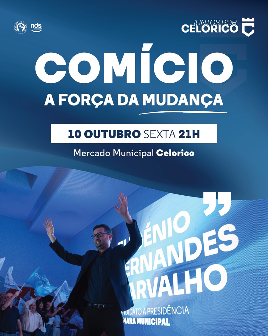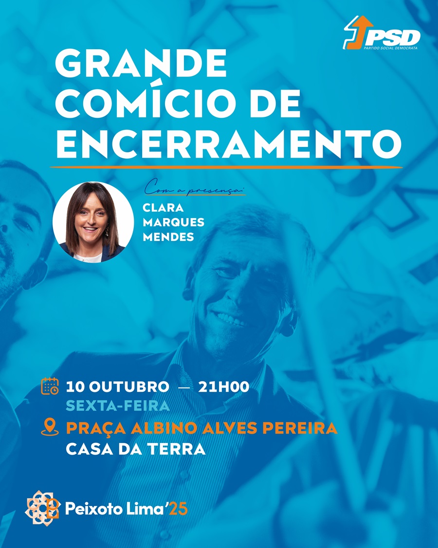 A candidatura Peixoto Lima ’25 vai realizar-se na sexta-feira, dia 10 de outubro, o comício de encerramento, que terá lugar na Praça Albino Alves Pereira (Casa da Terra), a partir das 21h00. O evento contará com a presença especial de Clara Marques Mendes, e “pretende ser um momento de união e mobilização de todos os celoricenses em torno de um projeto de continuidade, responsabilidade e visão para o futuro.”, diz a candidatura em comunicado.
