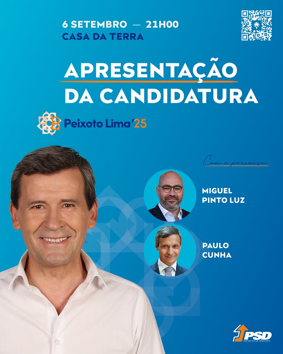Miguel Pinto Luz acompanha José Peixoto Lima na apresentação oficial da candidatura anunciada para 6 de setembro (próximo sábado), na Casa da Terra em Celorico de Basto, pelas 21 horas. A cerimónia contará com a presença de Miguel Pinto Luz, Conselheiro Nacional do PSD. O partido descreve-o como “figura de relevo da política nacional, reconhecido pelo percurso político e pela defesa firme dos valores do partido social-democrata.” Também Paulo Cunha, Presidente da Distrital de Braga do PSD, marcará presença neste momento num claro apoio à recandidatura de José Peixoto Lima, atual Presidente da Câmara Municipal de Celorico de Basto. “A apresentação oficial da candidatura Peixoto Lima‘25 simboliza o arranque de uma caminhada eleitoral que pretende renovar a confiança dos celoricenses num projeto de continuidade, dedicação e visão no futuro.”, revela em comunicado.