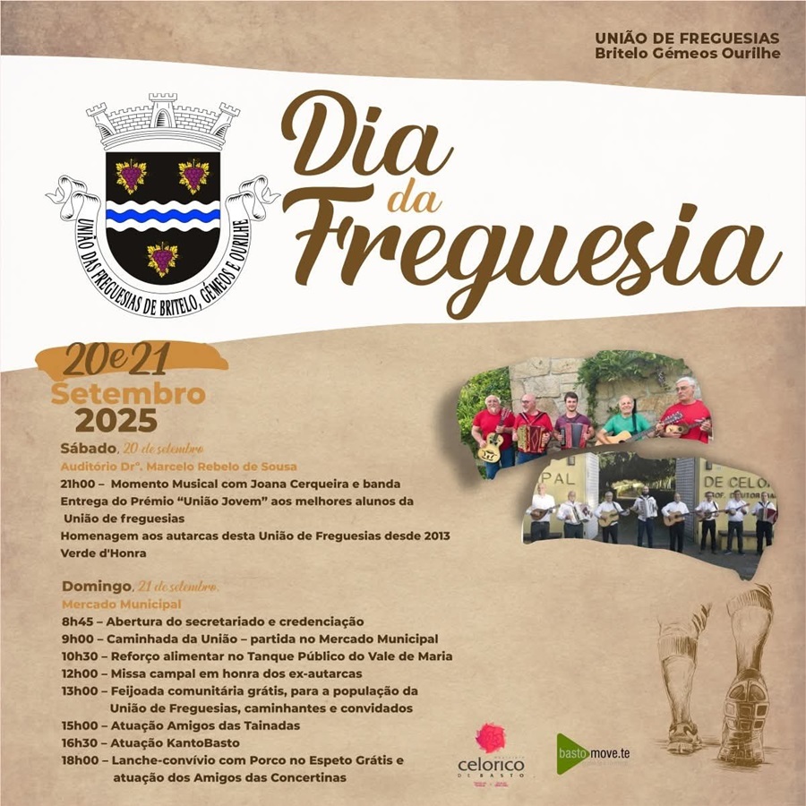 A Junta da União de Freguesias de Britelo, Gémeos e Ourilhe, em Celorico de Basto, vai realizar o Dia da Freguesia. Este ano a elebraçao acontece nos próximos dias, 20 e 21 de Setembro. A entrega dos diplomas de mérito escolar aos melhores alunos do 1°, 2° e 3° ciclos e ensino secundário, residentes na nossa União de Freguesias vai acontecer no próximo sábado (20) no Auditório Municipal. No dia 21, domingo, está marcada uma caminhada com partida às 08h45 do Mercado Municipal 8ver cartaz abaixo). Está também prevista missa campal em memória dos ex-autarcas, almoço convívio, animação musical e lanche convívio.