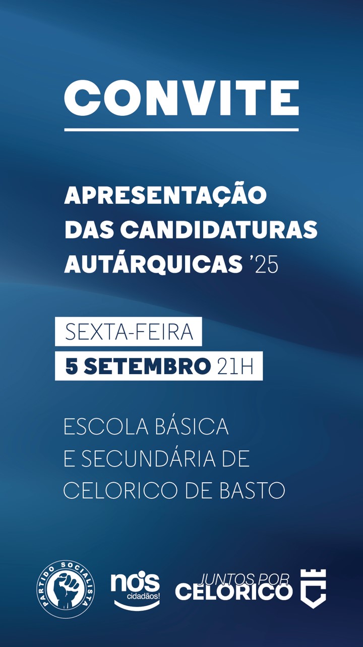 A Coligação “Juntos Por Celorico” vai apresentar oficialmente, sexta-feira (5 de Setembro), a lista de candidatos às próximas eleições autárquicas marcadas para Outubro deste ano. Nas redes sociais a coligação (PS/Nós Celorico) tem publicado vídeos de apresentação de quem fará parte das listas. Hernani Bastos, Fernando Vilas Boas, a jovem Catarina Sousa, o empresário António Machado e João Nuno Teixeira já se apresentaram através das redes sociais neste projeto. Ao longo das últimas semanas a coligação PS /Nós Celorico avançou também com os candidatos às juntas de freguesia. A apresentação oficial de sexta-feira está marcada para as 21h00, na Escola Básica e Secundária de Celorico de Basto.