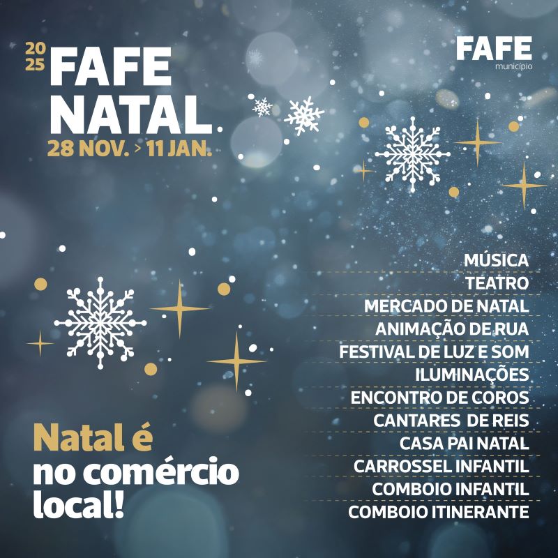 O Município de Fafe já apresentou o programa do FAFE NATAL 2025, que promete voltar a encher o centro da cidade de luz, música, animação e espírito natalício. Entre 28 de novembro de 2025 e 11 de janeiro de 2026, Fafe transforma-se num verdadeiro palco de Natal, com dezenas de atividades para toda a família.A abertura oficial está marcada para sexta-feira, 28 de novembro, às nove da noite, com a inauguração das iluminações que assinalam o arranque de mais de um mês de programação cultural e comunitária.O espetáculo de luz volta a ser um dos grandes destaques. Na Praça 25 de Abril, as apresentações decorrem diariamente às 18h, 19h, 20h, 21h e 22h, com uma sessão extra às 23h às sextas, sábados e vésperas de feriado. Já na Praça da Justiça, os horários variam entre as 18h30 e as 21h30, com sessão adicional às 22h30 nos mesmos dias.O Mercado de Natal será novamente o coração da animação, com gastronomia, artesanato, produtos locais e muita música. Não vão faltar também as atrações preferidas dos mais novos — a Casa do Pai Natal e o Comboio Itinerante, que voltam a percorrer as ruas da cidade.A programação musical do FAFE NATAL 2025 volta a reunir dezenas de artistas, coros e grupos locais e nacionais.Ao longo de dezembro, o Mercado de Natal será palco de espetáculos musicais, teatro e atividades infantis, que prometem animar miúdos e graúdos. Nas ruas, destaque para a Parada de Natal e para a chegada do Pai Natal, marcada para o dia 7 de dezembro, às quatro da tarde.Sob o mote “Leitura, Comunidade e Tradição”, regressa também a iniciativa “Hora Mágica de Natal”, que promove o livro e a leitura com sessões temáticas nos dias 15, 17, 19, 22 e 23 de dezembro.A dimensão comunitária reforça-se com os tradicionais passeios de Pais Natais e, já em janeiro, com os Cantares de Reis, que envolvem escolas e associações culturais, encerrando simbolicamente a quadra festiva.A Casa do Pai Natal estará aberta de 7 a 21 de dezembro, em dias selecionados, e o Comboio Itinerante circulará entre 29 de novembro e 23 de dezembro, das 16h às 22h. O município reforça este ano o apoio social e comunitário, com ações como “Hoje por Ti, Amanhã por Mim” e o Cabaz Solidário, já em andamento.Será ainda lançada uma campanha de apoio ao comércio local.